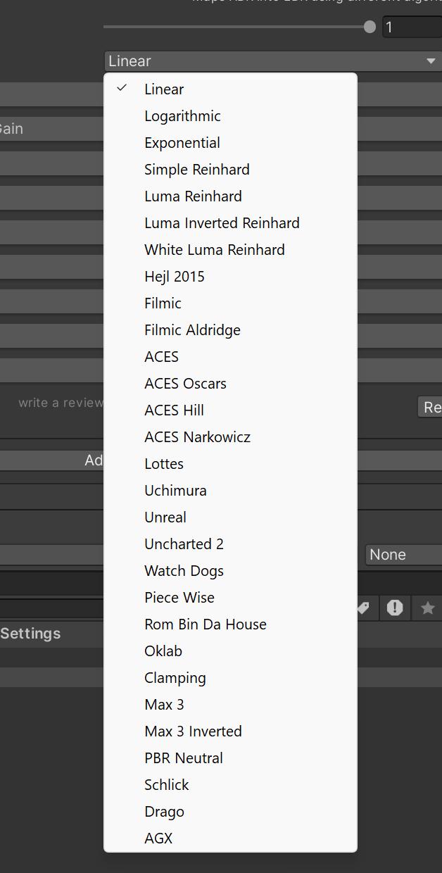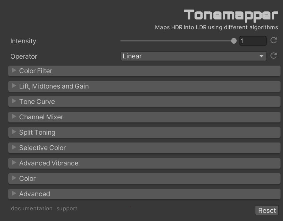 Intensity, controls the overall strength of the tonemapping effect. Note: An intensity of 0 will disable the effect entirely.Choose from 28 different tonemapping algorithms, each with unique characteristics: