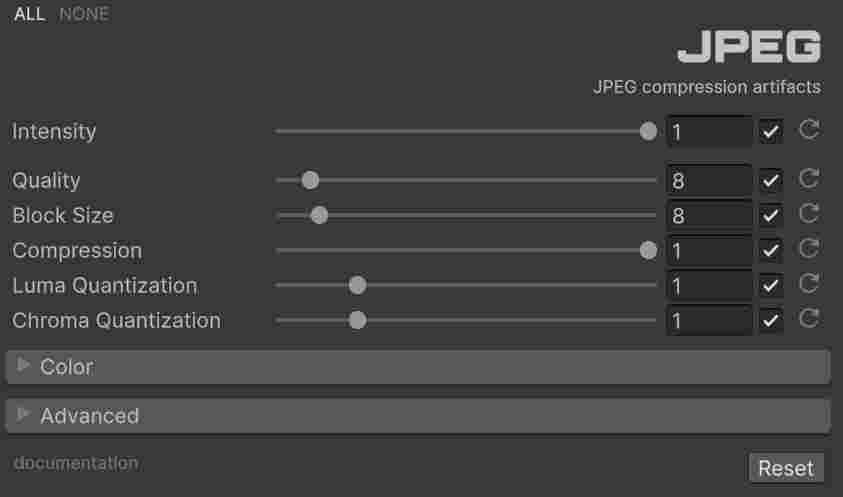 The effect integrates with Unity’s Volume system for seamless runtime parameter modification. Access the JPEGVolume component through the Volume Profile.