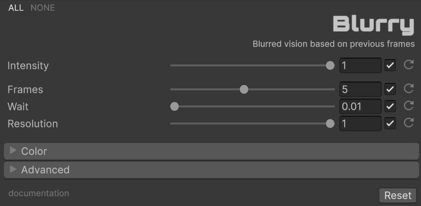 ‘Blurry’ creates delayed blurred vision by blending the current frame with a configurable history of previous frames. It feels temporal rather than purely optical, which makes it well suited to dizziness, dream sequences, concussions, intoxication, and slow-motion shock states.