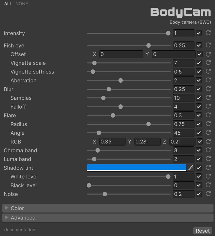 For ‘BodyCam’, this section follows the exact custom inspector order, beginning with the ‘Fish eye’ block and its nested lens-shaping controls.
