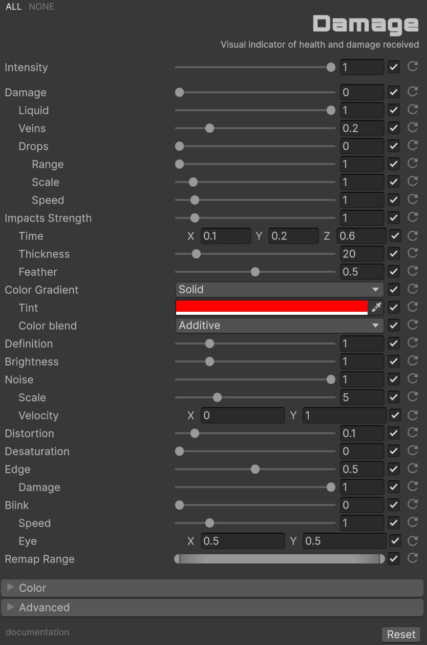 ‘Damage’ is a complete hit-feedback effect for health loss, impacts, and low-health stress. It combines continuous injured-eye visuals with optional directional hit indicators and flash feedback.