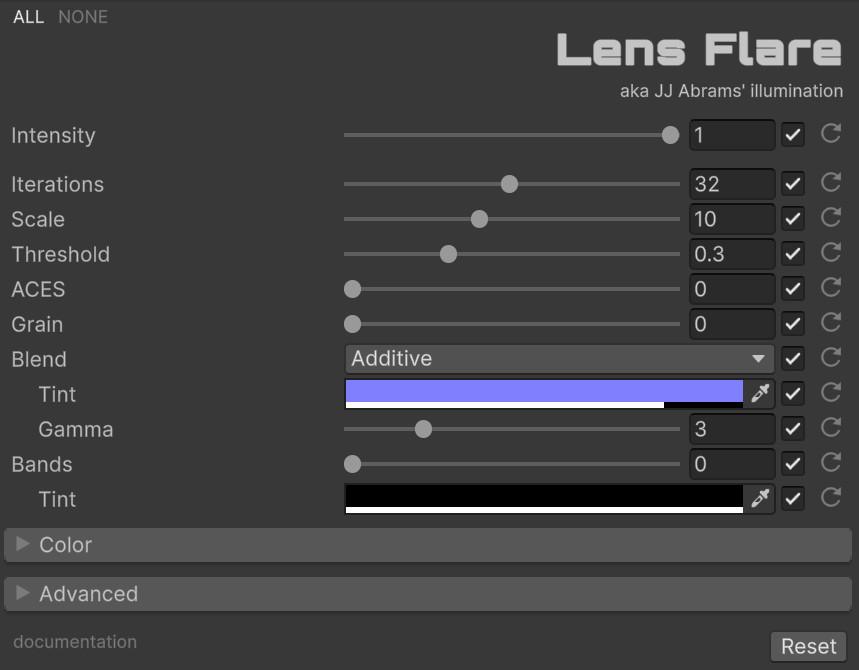 For ‘Lens Flare’, the explanation below keeps the exact inspector order, starting with the flare-generation controls before the nested blend and bands blocks.