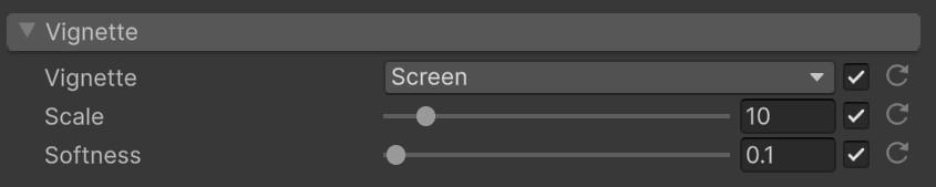 Use the ‘Vignette’ foldout in the custom inspector to configure the framing controls summarized below.