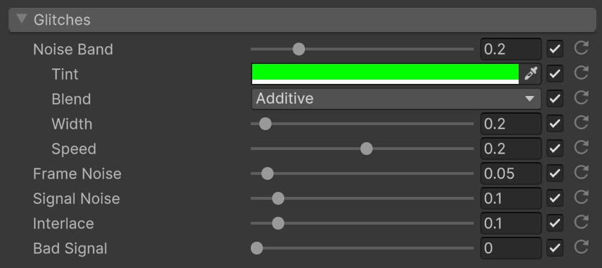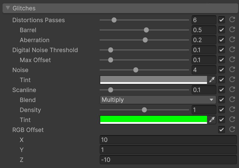 The custom inspector groups the distortion, digital noise, scanline, and RGB-offset artifacts inside the ‘Glitches’ foldout.