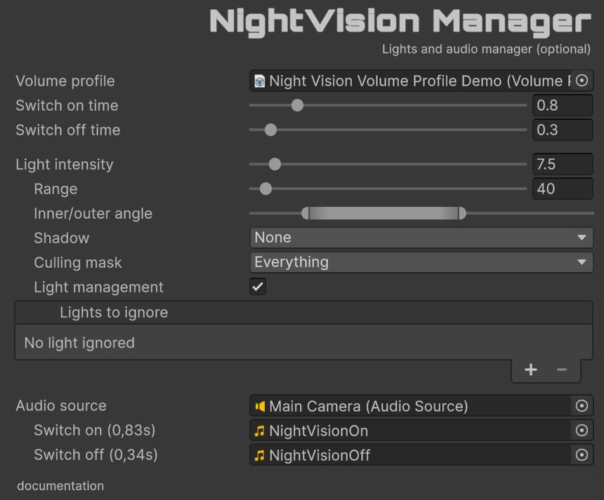 NightVisionVolume used by the manager.The manager also exposes an OnSwitch event and will create a hidden spotlight automatically if light management is enabled and no light is already present.