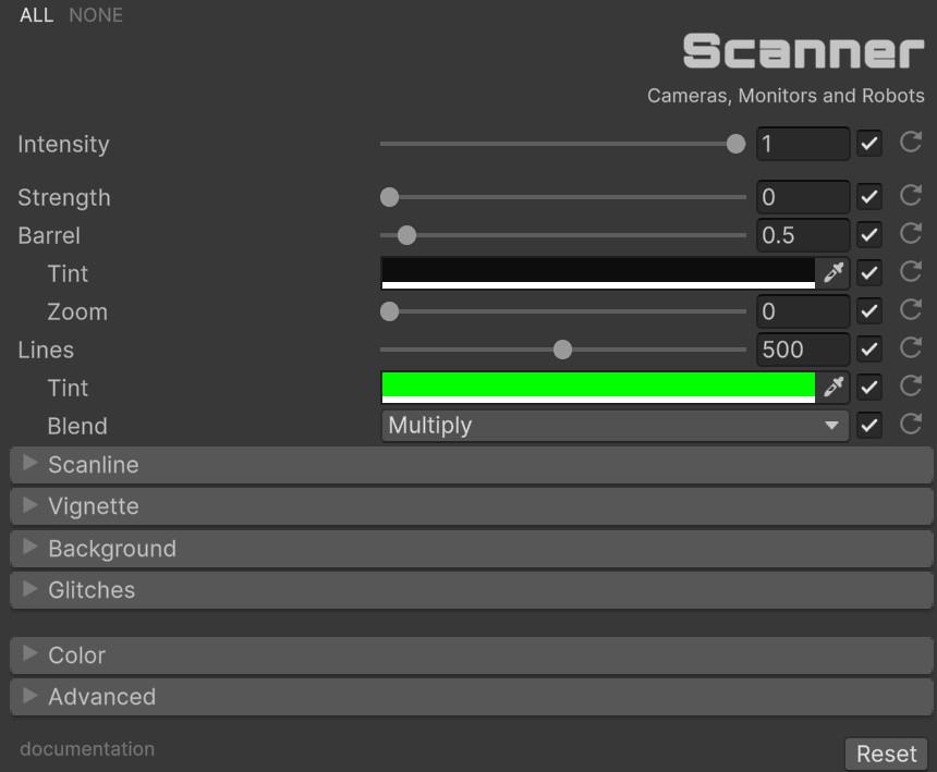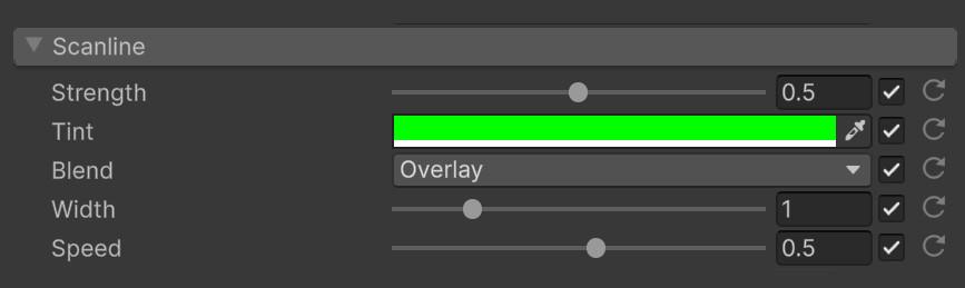 | Scanline / Blend / Density / Tint | Scanline artifact and its nested controls |