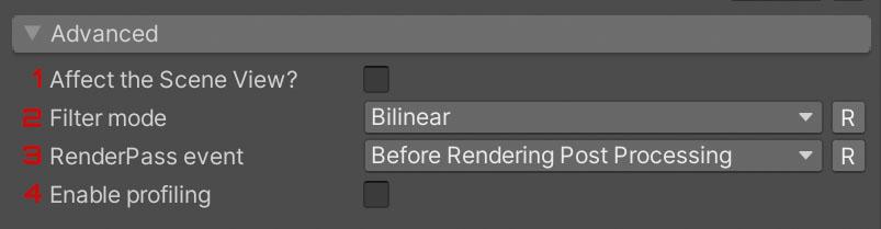 Although it is not recommended to change it, with ‘RenderPass event’ (3) you can modify at which point in the render pipeline the effect is applied. Finally, activate ‘Enable profiling’ (4) to show in the ‘Profiling’ window the metrics of the effect.