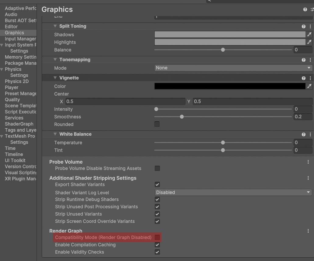 Make sure that the ‘Compatibility Mode’ is disabled (Project Settings > Graphics > Render Graph).