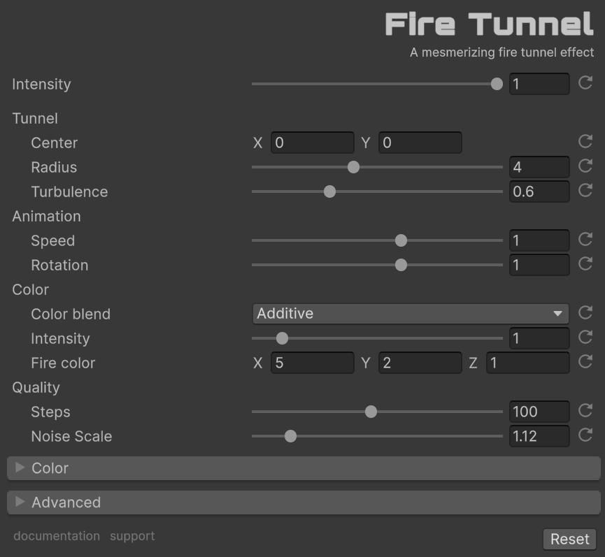 StartCoroutine(CloseFireTunnel());All effects have a panel, ‘Color’, in which you can modify the final color of the effect.