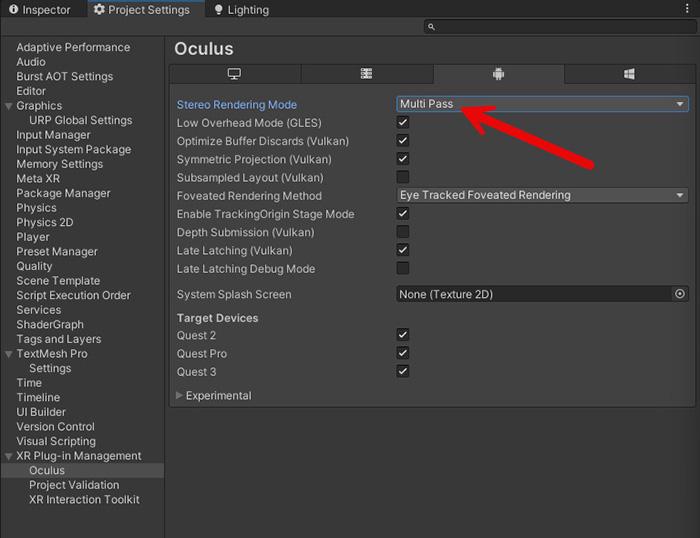 To increase compatibility with VR devices, I recommend that you select ‘Stereo Rendering Mode’ in ‘Multi Pass’ mode: